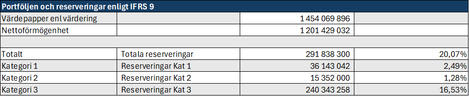Fondens reserveringar enligt IFRS 9 har ökat något sedan årsskiftet och har påverkat resultatet med -5,1 Mkr under 2026. Utgående reserv uppgår per 28 februari uppgår till -291,8 Msek att jämföra med reserven per sista december som uppgick till -286,7 Msek.