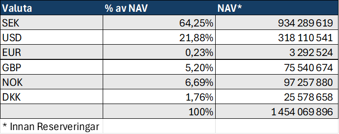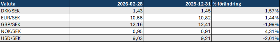 Förändringen under månaden beror på att kurserna på de noterade innehaven i portföljen har gått ner. Vi har inte gjort några direkta omvärderingar i övrigt. Som tidigare under 2025 har förstärkningen av den svenska kronan fortsatt mot övriga valutor förutom mot den norska kronan som till skillnad från övriga valutor stärkts under 2026. Utfallet framgår av tabellen nedan.