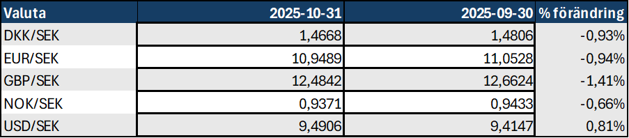 The change during the month is mainly due to the listed holdings in the portfolio which have decreased in value as a result of the prices having decreased during the month. The remaining part of the change is partly due to currency changes, where the krona has strengthened during the month against all currencies in the portfolio except for the dollar which had a positive change in October. However, since the previous monthly comment in August, the currency change is negative for all currencies except for the Norwegian krone.