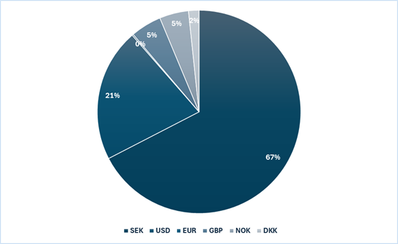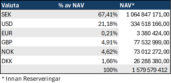 As previously described, the fund is affected by the movement of the Swedish krona against other currencies to which the fund is exposed. The monthly development of the fund's currencies is shown in the table below. Currency changes have affected the portfolio both positively and negatively during the year. Overall, however, during the year we have had a strengthening of the krona, which has meant a weakening of the dollar by -14.2% and by -9.9% against the pound. In total, the change in value is approximately SEK -75 million during the year.